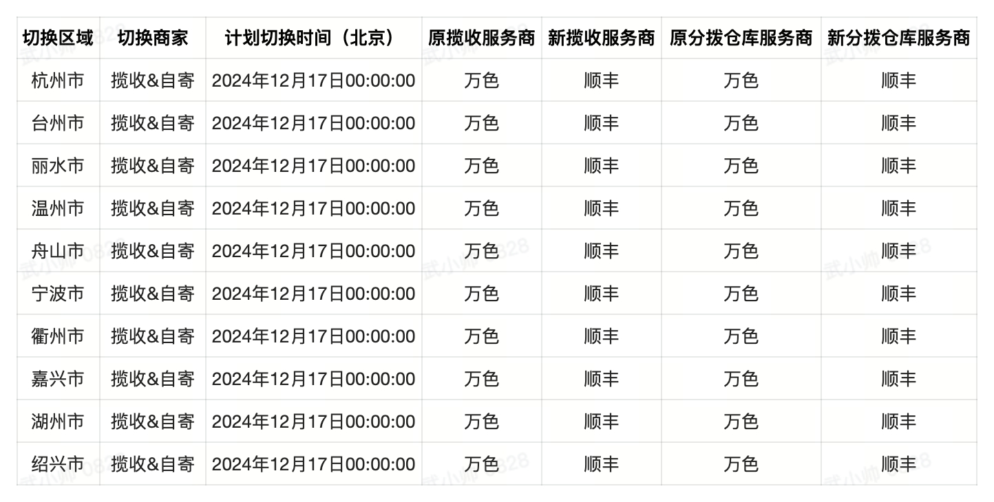 | 物流 | 2024/12/17 | 东南亚跨境所有国家 | 跨境直发金华顺丰仓切单信息同步 | 为进一步优化分拨仓分单,跨境A段分拨仓计划将于北京时间2024年12月17日00:00:00开始将浙江省除金华义乌以外的揽收和自寄订单(珠宝类目除外)均从义乌万色仓切接到金华顺丰仓![]() | https://seller.tiktokglobalshop.com/university/course?identity=1&role=1&learning_id=7523709560850177&from=course&content_id=7012429621085953 |