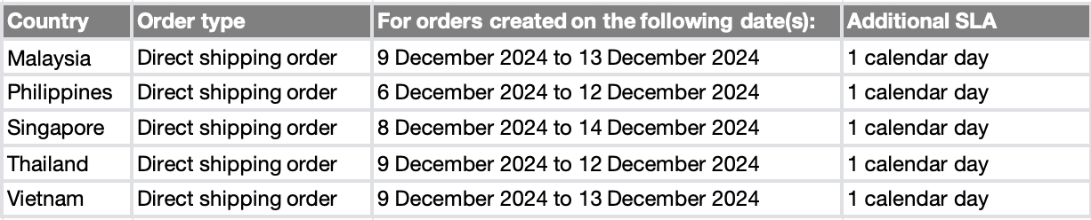| 政策 | 2024/12/27 | 东南亚跨境所有国家 | 【履约时效调整通知】2025年元旦假期跨境商家境内直发订单履约时效延长 | 1. 📮 元旦假期履约时效延长通知▪ 2025年元旦假期在履约层面向商家提供帮助,将根据下单日延长履约时效,本次延长适用于东南亚的跨境直发订单(不包括海外本地发货模式),具体细则如下:![]() 2. 🔗 相关链接▪ 如果需要获得更多关于TikTok Shop商家跨境客户订单发货指引,请点击 跨境买家订单发货规则(东南亚)3. ✅ 其他事项▪ 同时,上述通知内容也将通过站内信和邮件的方式触达东南亚跨境商家。 | https://seller.tiktokglobalshop.com/university/essay?knowledge_id=6837857193412354&role=1&identity=1 |
