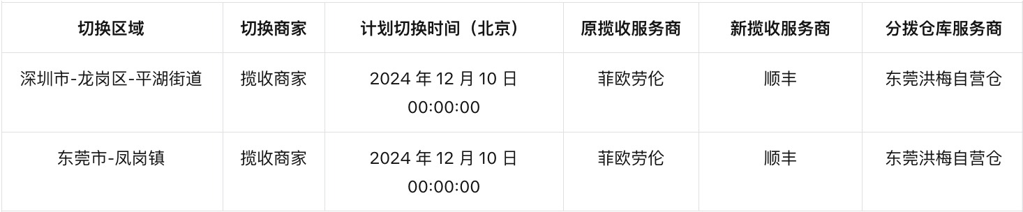 | 物流 | 2024/12/10 | 东南亚跨境所有国家 | 头程揽收服务商切换公告 | 为进一步优化揽收网络,跨境头程揽收将于北京时间2024年12月10日00:00:00后开始将【东莞市-凤岗镇、深圳市-龙岗区-平湖街道】的揽收服务商由原菲欧劳伦切换为顺丰(珠宝类目商家除外)![]() | https://seller.tiktokglobalshop.com/university/essay?identity=1&role=1&knowledge_id=6482089772828433&from=feature_guide |