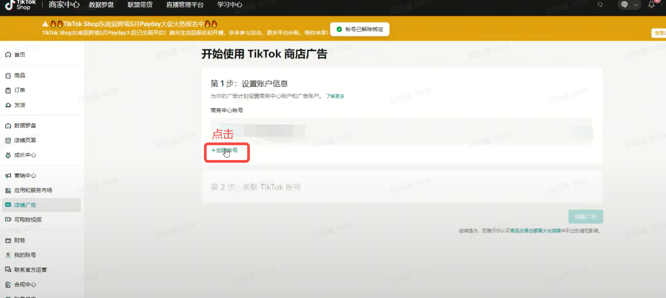 | 创建商务中心账号 | 第一步:在【商家中心】点菜单栏【店铺广告】,开始使用TikTok商店广告 | ![]() |