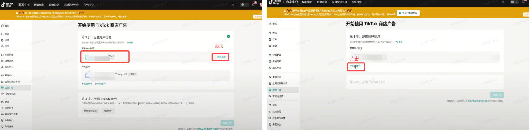 | 第二步【情况1】对于没有绑定过商务中心账户的店铺,直接点击【创建账号】即可【情况2】对于已经绑定过商务中心账户的店铺,需要先点【解除绑定】,页面刷新后,再点击【创建账号】需要注意:如果原广告账号正在进行广告投放,解绑会使得正在投放的广告停止 | 【情况1】![]() 【情况2】 ![]() | |