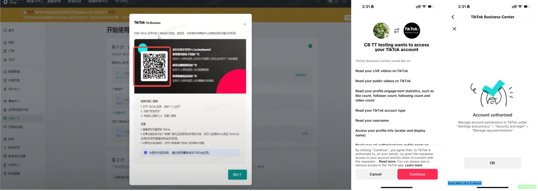 | 第二步:用TikTok账号扫码关联店铺 | ![]() | |