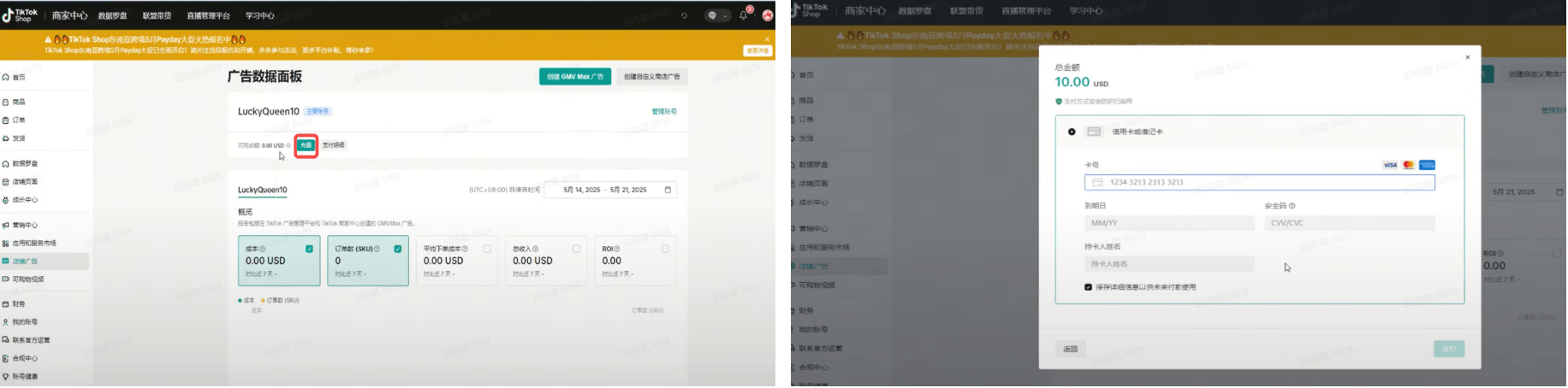 - 5)线上充值方式:目前支持GMV pay(使用商家在TikTok Shop的收入直接付款)以及master/visa等外卡支付。后续会上线国内支付渠道(支付宝等),敬请期待