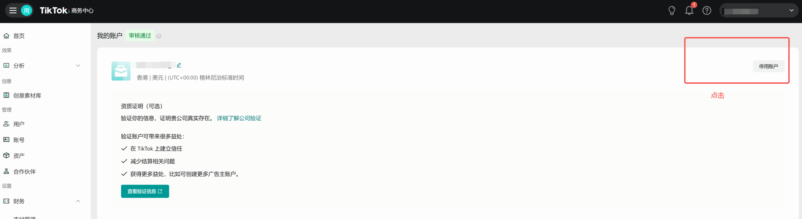 | 停止账号投放 | 第一步:在【商务中心】点菜单栏【验证】 | ![]() |