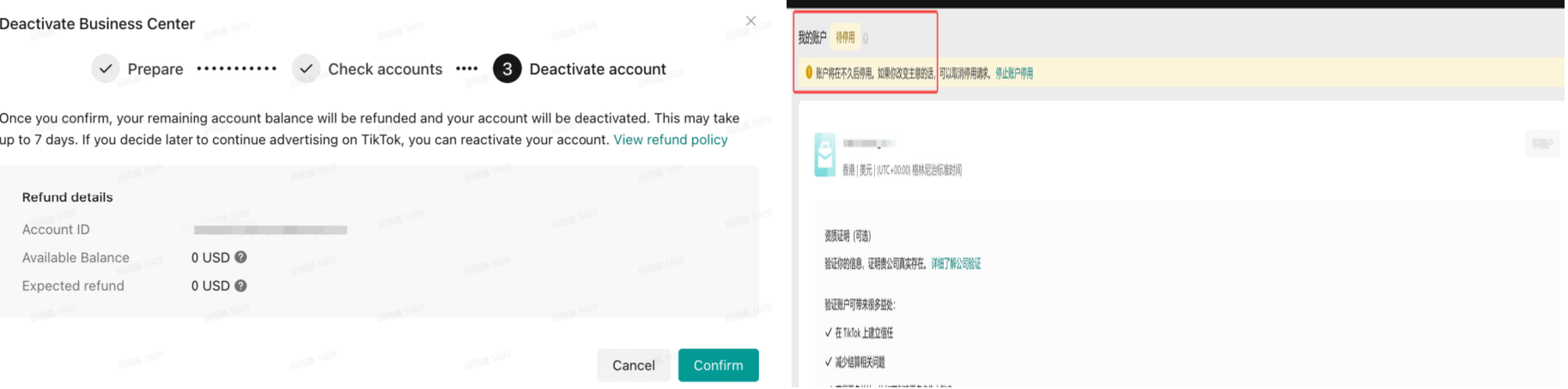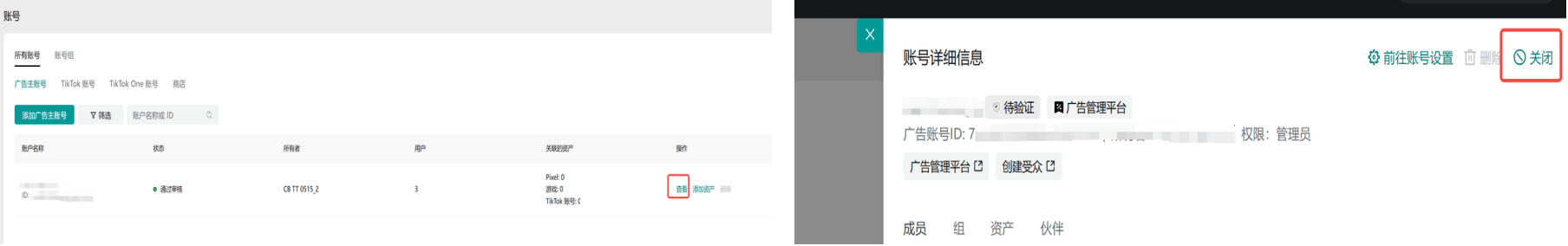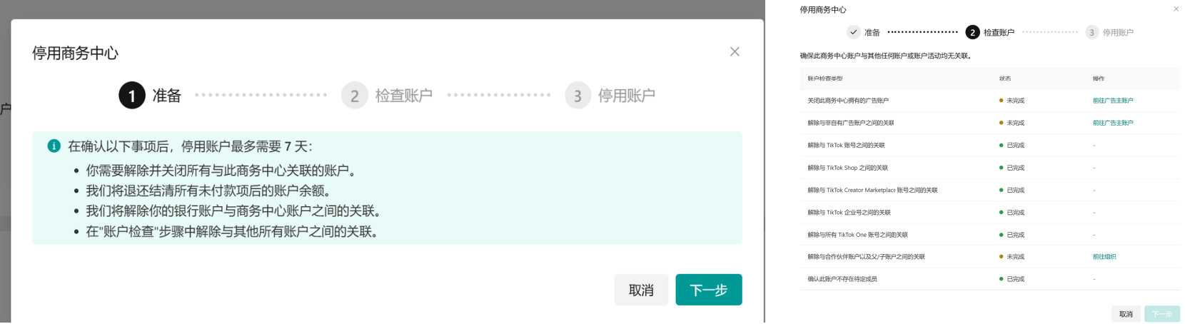 | 第三步:根据指引,完成商务中心账号的所有停用操作(对于所有未完成的操作,用户可以直接点击右侧蓝色链接跳转完成) | 停用操作:![]() 额外补充,如何关闭广告账户:点击【查看】再点击右侧【关闭】,如图所示(需要注意目前广告账户不支持重新激活,会变成永久停用) ![]() | |