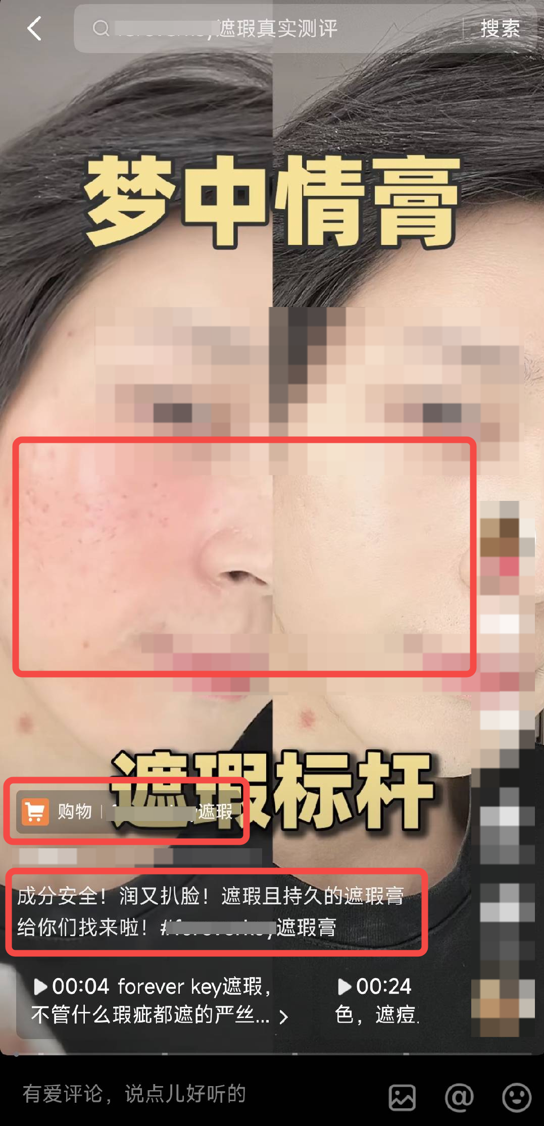 | 测评推荐类 | 表现形式:真人使用、数据、效果应征内容核心:同类品/推荐品的使用效果对比转化链路:挂车、引流直播间、泛商城转化 | 美妆博主/直播,亲自使用一款遮瑕膏产品遮痘印,并且做前后对比,突出遮瑕力强,丝滑自然不假白。数码产品博主测评近期2-3款热销手机/键盘/鼠标/数据线等产品,讲解产品的手感等亲身体验感。 | ![]() ![]() | 美妆个护类目:美妆、美容护肤、头部护理与造型、洗浴与身体护理手机与数码类目:手机配件、摄影摄像、影音设备、游戏设备、智能及穿戴设备 |