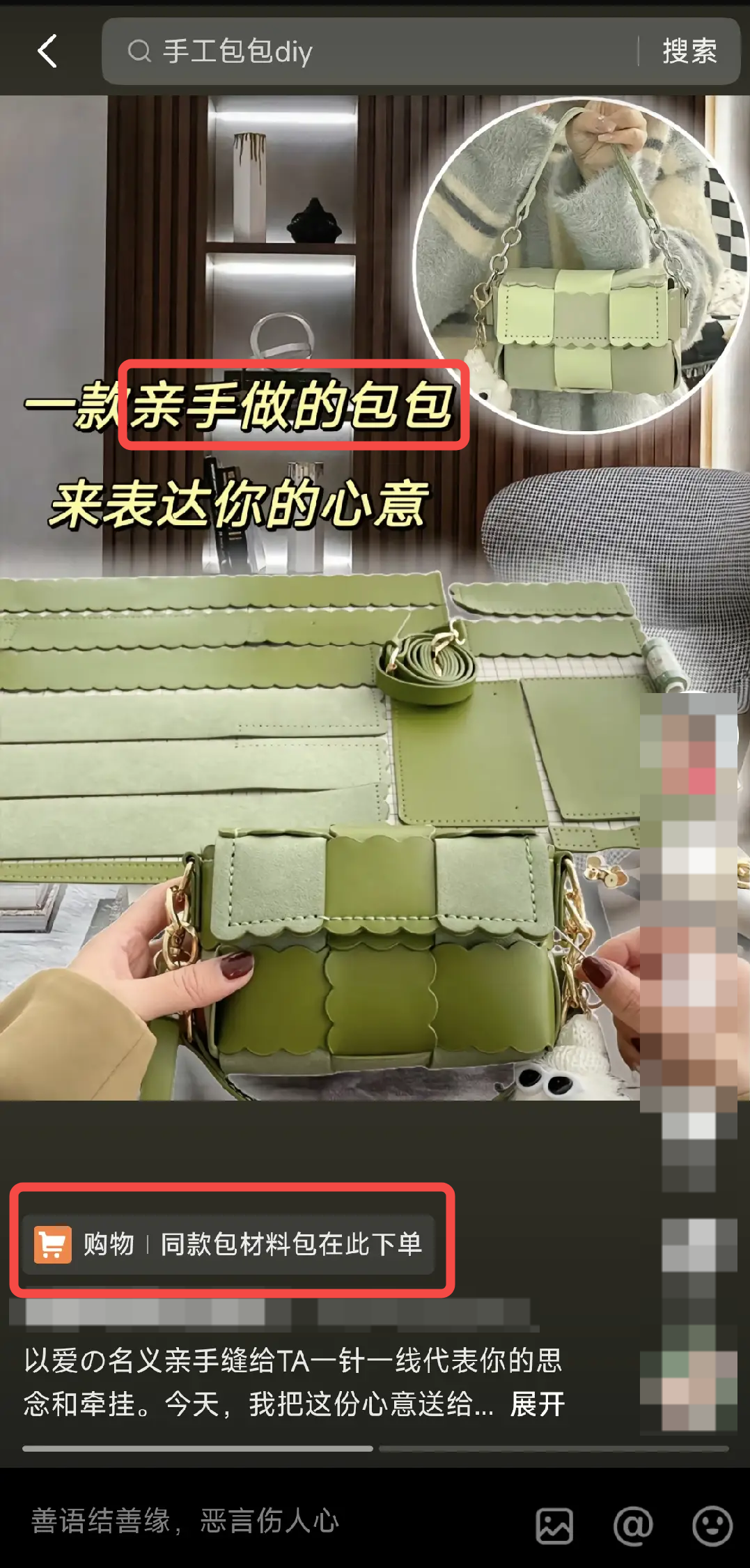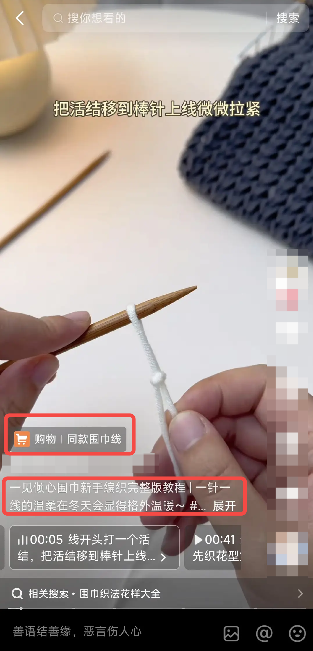 | 工艺教程类 | 表现形式:记录亲手操作、强调品质/效果/感受,进行安利内容核心:给受众理由,为商品种草转化链路:挂车、引流直播间、泛商城转化 | 马上圣诞节/情人节了,给你的闺蜜/爱人亲手做一个毛毡、包包、发夹等等。天气转凉,给你的女朋友织一条围巾。 | ![]() ![]() | 时尚配饰类目:服饰配件、平价饰品、发饰 |