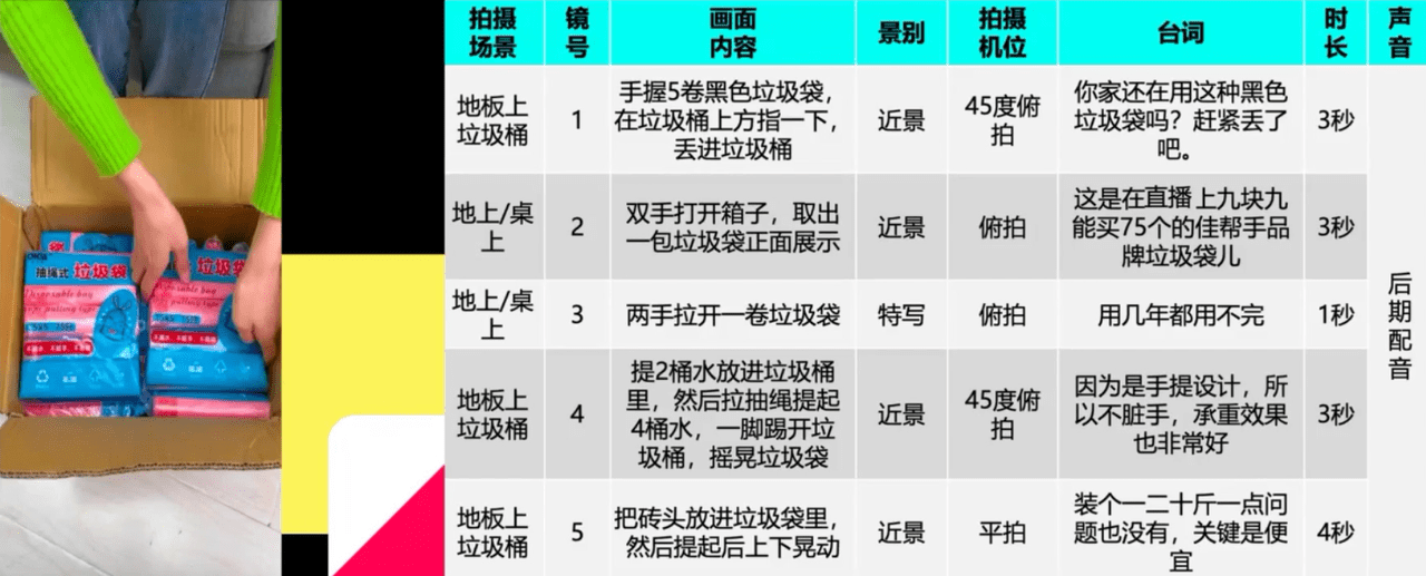 | 第二步 | 撰写脚本 | 确定视频呈现形式多浏览当地视频,找到所经营地区的短视频网感。根据产品写脚本文案如果有确定产品的,直接通过产品关键词去找对标账号和对标视频,找到往期高播放、近期高播放的视频作为案例进行拆解学习。 (下面给大家整理了一个拆解对标视频进行学习的流程,拆解视频时需要带着以下几个问题来进行学习) 整体感受是什么?选题台词是什么?场景是什么?如何展现?每个镜头是怎么表达的?音效如何体现?剪辑的方式? 暂时无法在飞书文档外展示此内容拍摄人员和出镜人熟悉脚本拍摄人员熟悉产品描述性信息 | 脚本重要性: ![]() 脚本八大要素: ![]() 脚本组成逻辑: ![]() 拍摄分镜头脚本举例: ![]() 根据自身长处对拆解的视频进行二次创新: 在哪个领域有优势,就在那个区域弯道超车。创新超越的核心目的是把内容的的核心指标数据给提升上去,让视频素材在冷启动赛马中快速跑出线并爆起来。 爆款商品通性:产品为主,突出核心,创意为辅,增加传播在10-20秒内做到高效种草和割草 强种草属性:给一你种“我的天?居然还这能样?”的感觉,这里要么是可视性强的新品,要么是效果明显的功效品 强收割属性:给你一种“这么划算,不买就亏了”的感觉极其精练:一句多余话/一秒多余画面,都不要 |