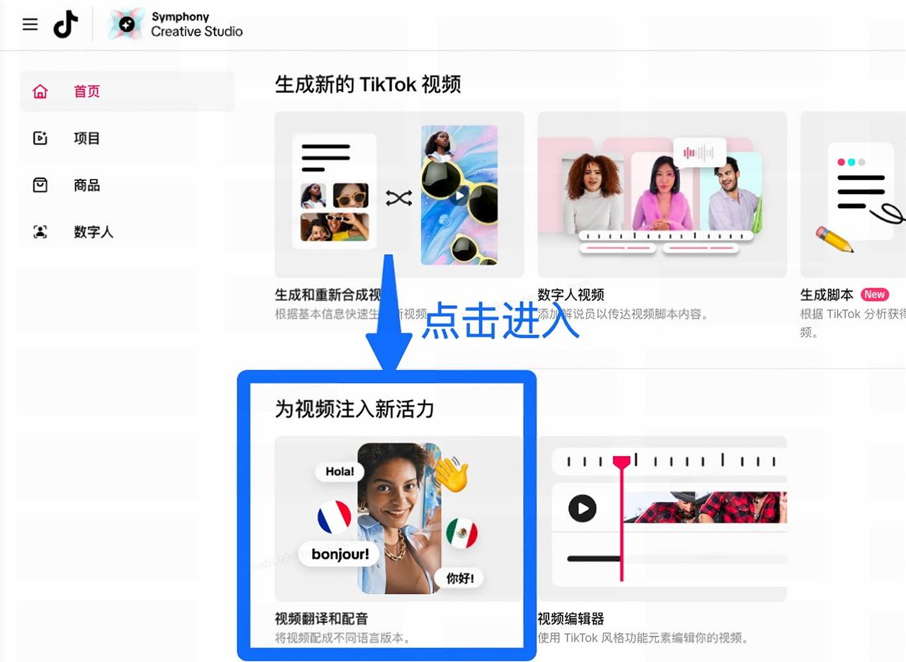 TikTok Symphony是一个免费的、由AI驱动的视频生成工具,包含商品一键成片、数字人口播成片、视频翻译&配音等功能