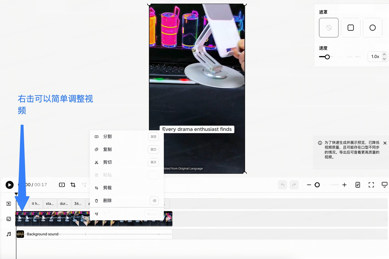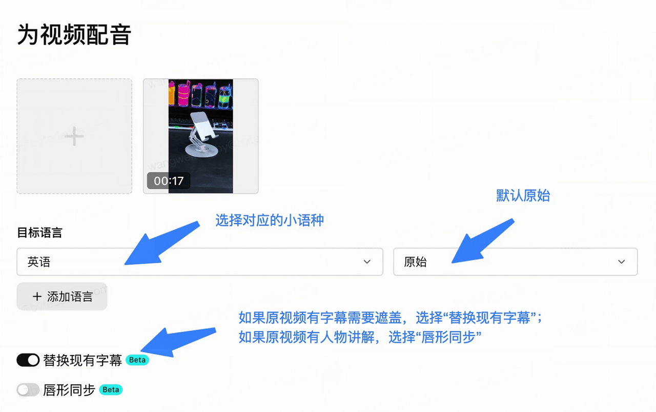 - 当前配音功能的英语能力较为完备,同时支持泰语及越南语,能力持续优化中,暂不支持马来语功能