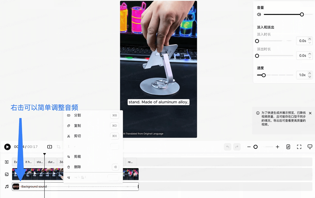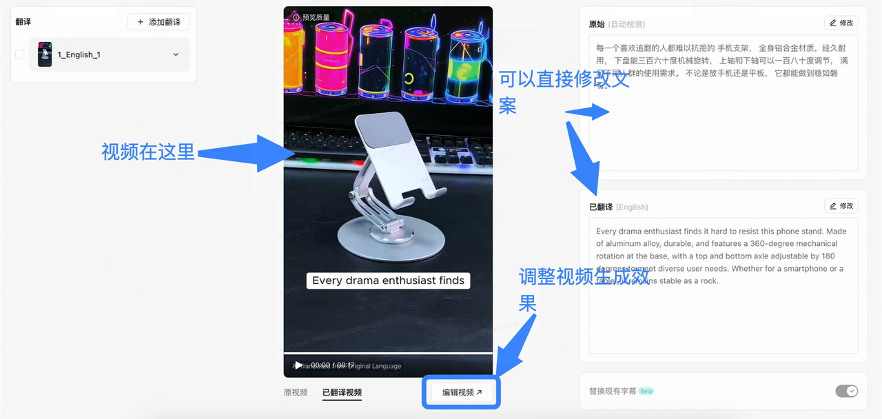 - 纯商品展示类的短视频一键翻译效果较好,一键生成后无需人工调整