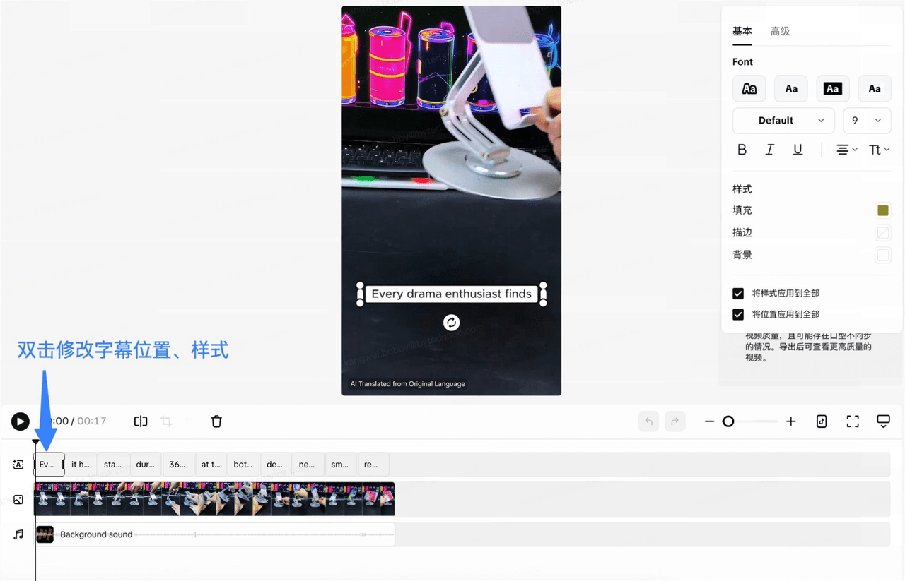 | 若想进一步编辑视频,点击右下角编辑视频,你将可以调整字幕、视频、音频的位置、尺寸等 | ||