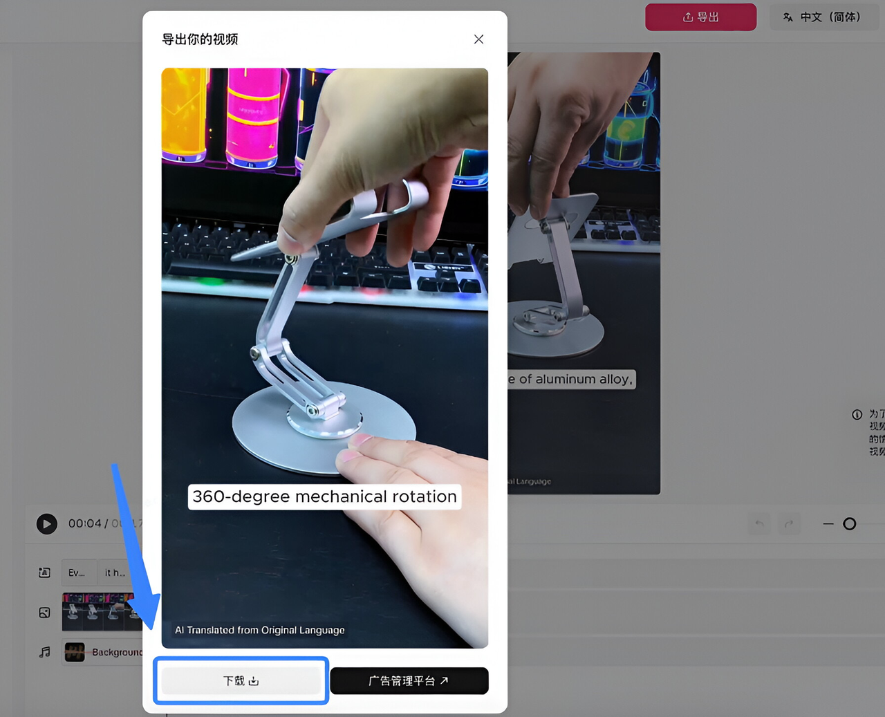 | 完成后选择导出,视频将在导出过程中进行渲染和唇形同步 | 点击下载至本地,并通过商家后台发布 |