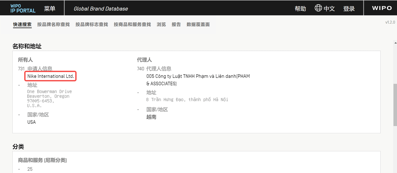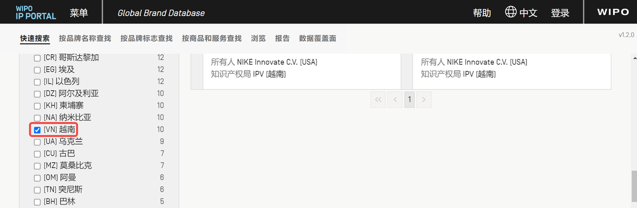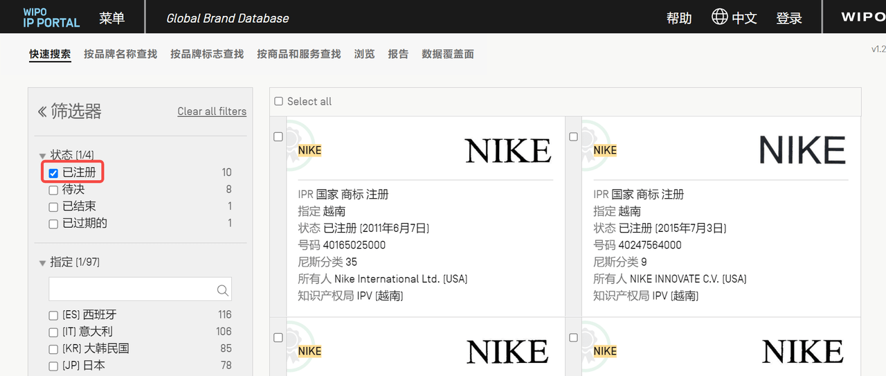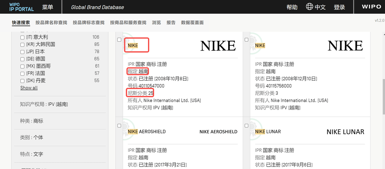 以下步骤以第25类商标“Nike”为实例,解读如何查询商标在WIPO成员国之一越南的有效注册情况: