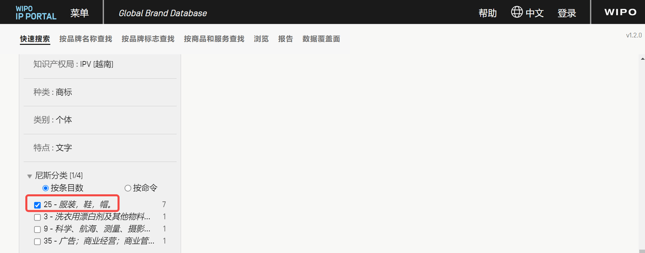 | 步骤五:下拉网页,在”尼斯分类“中勾选本次查询的商品的商标国际分类。此例中则选择“25-服装,鞋,帽”。 注:可在“附录:商标尼斯分类”部分查找不同类型的商品和服务对应不同的商标国际分类。 | ![]() |