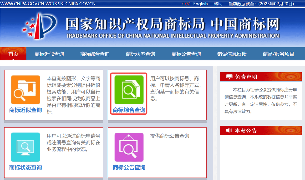 | 步骤一:打开国家知识产权局商标局官网,点击“商标综合查询”。 | ![]() |