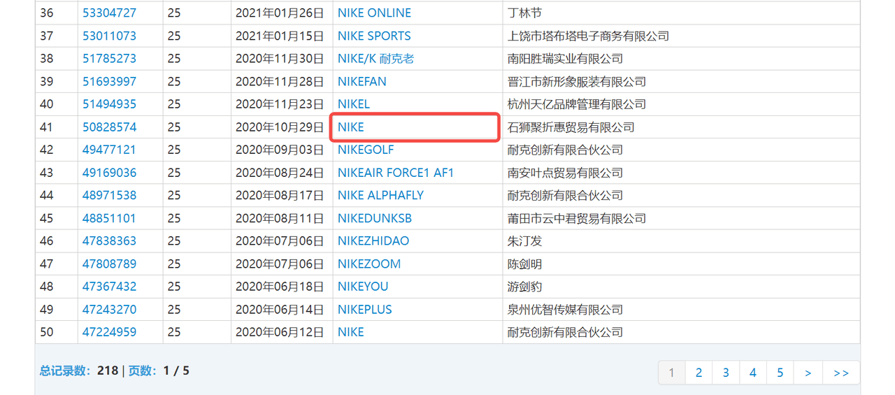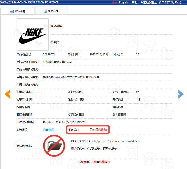 | 步骤三:在查询结果中选择符合“Nike”的商标,点击商标名称查看详情,可以查看有效持有人情况。 若商标状态显示“无效”(图1)、“形式审查”、“驳回”、“异议”等,均说明对应的申请人不是该商标的有效持有人。若商标状态显示“注册”(图2),说明对应的申请人是该商标的有效持有人。说明商家需要直接或间接得到“耐克创新有限合伙公司”的授权许可才可销售带有“Nike”商标的服装、鞋、帽等商品。 | ![]() ![]() (图1:商标状态显示“无效”,说明对应的申请人不是该商标的有效持有人。) ![]() (图2:商标状态显示“注册”,说明对应的申请人是该商标的有效持有人。) |