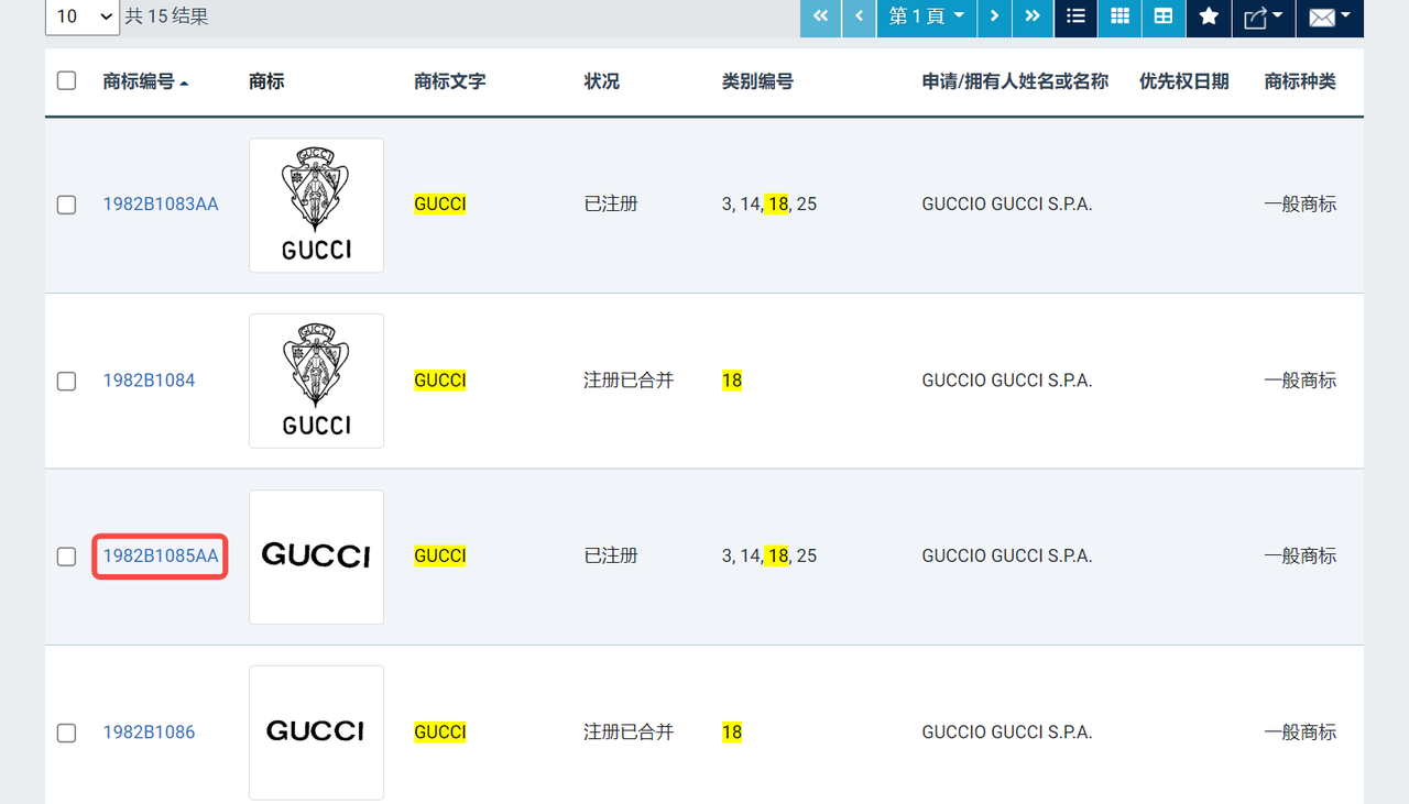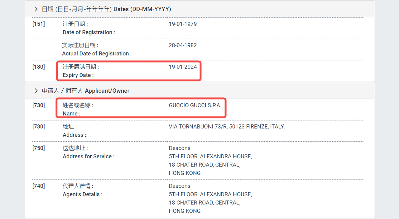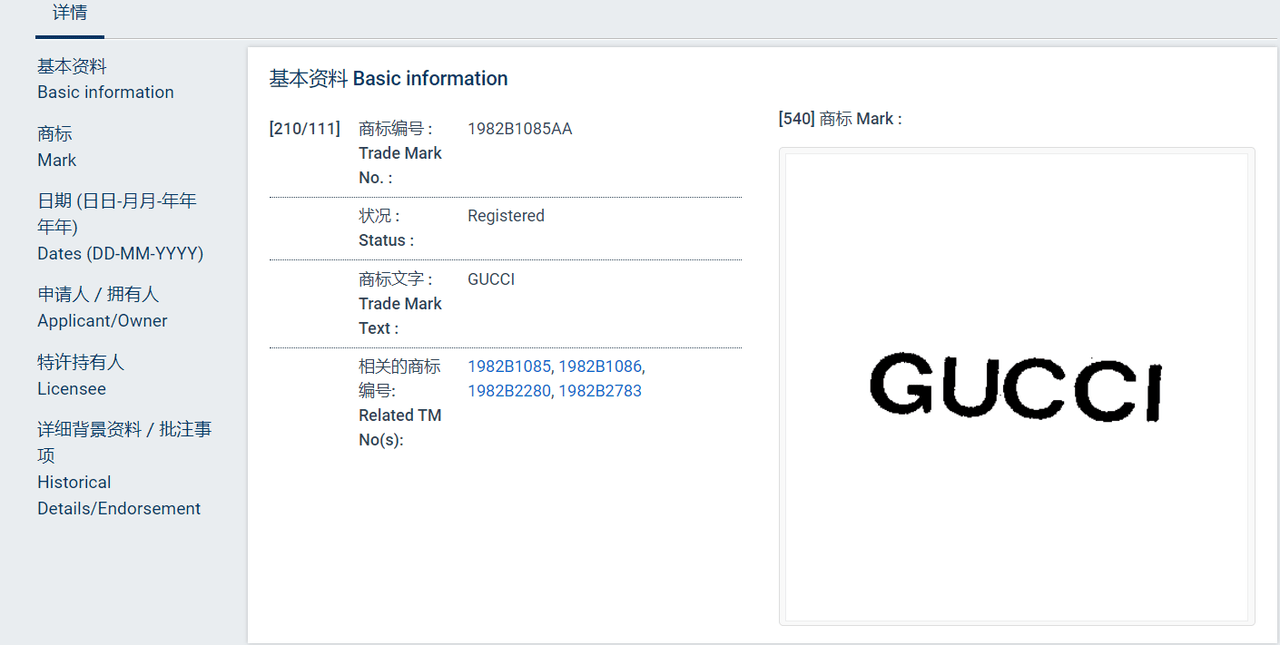 | 步骤三:在详情中,可以得到关于商标注册有关信息,包括“注册届满日期”和“持有人”等。 在本例中,商标详情显示,第18类“Gucci”商标的“注册届满日期”(即有效期)至2024年1月19日,持有人为“GUCCIO GUCCI S.P.A.”。 说明商家需要直接或间接得到“GUCCIO GUCCI S.p.A.”的授权许可才可销售带有“Gucci”商标的皮革制品等商品。 | ![]() ![]() |